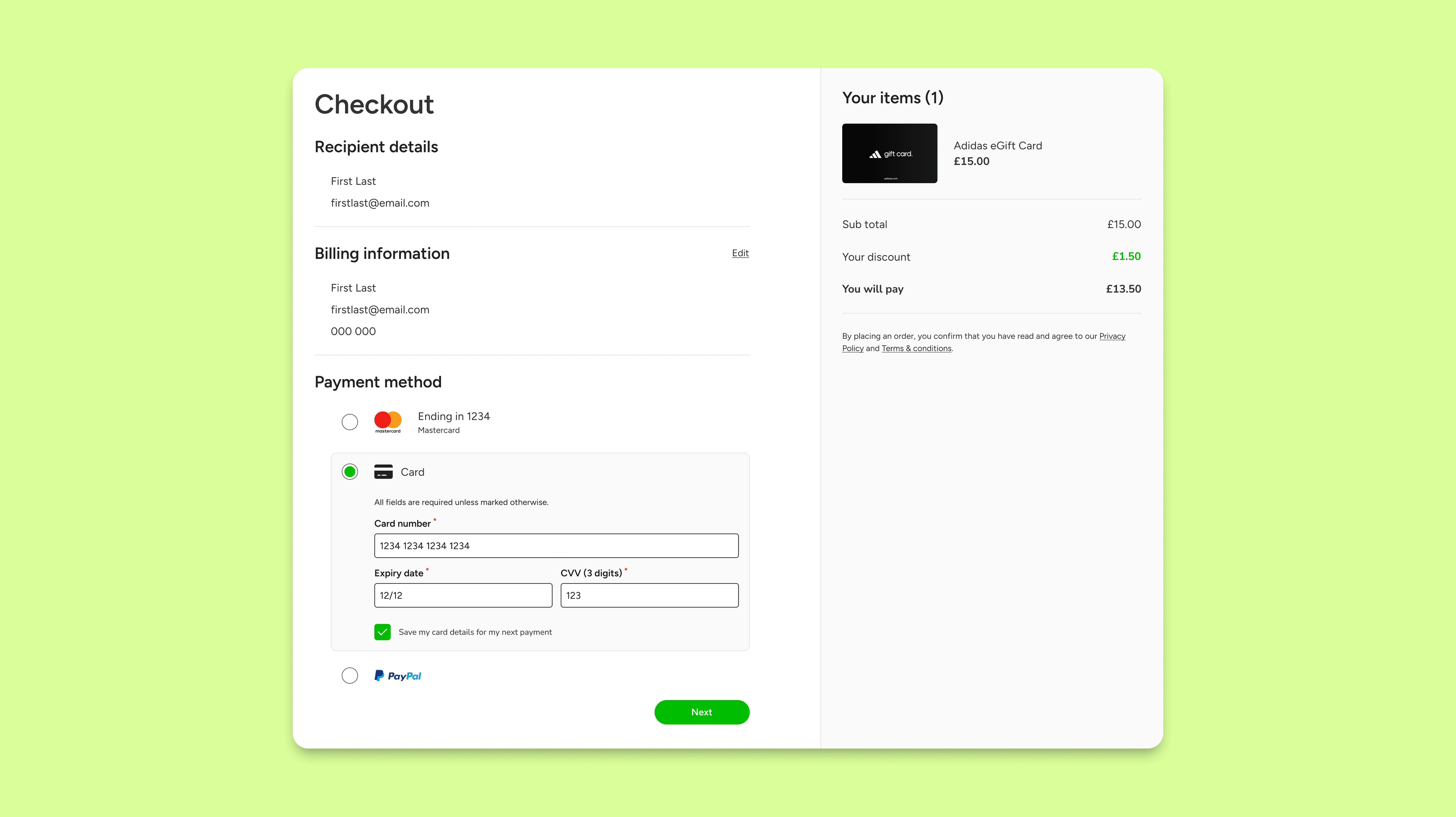 New gift card checkout user flow