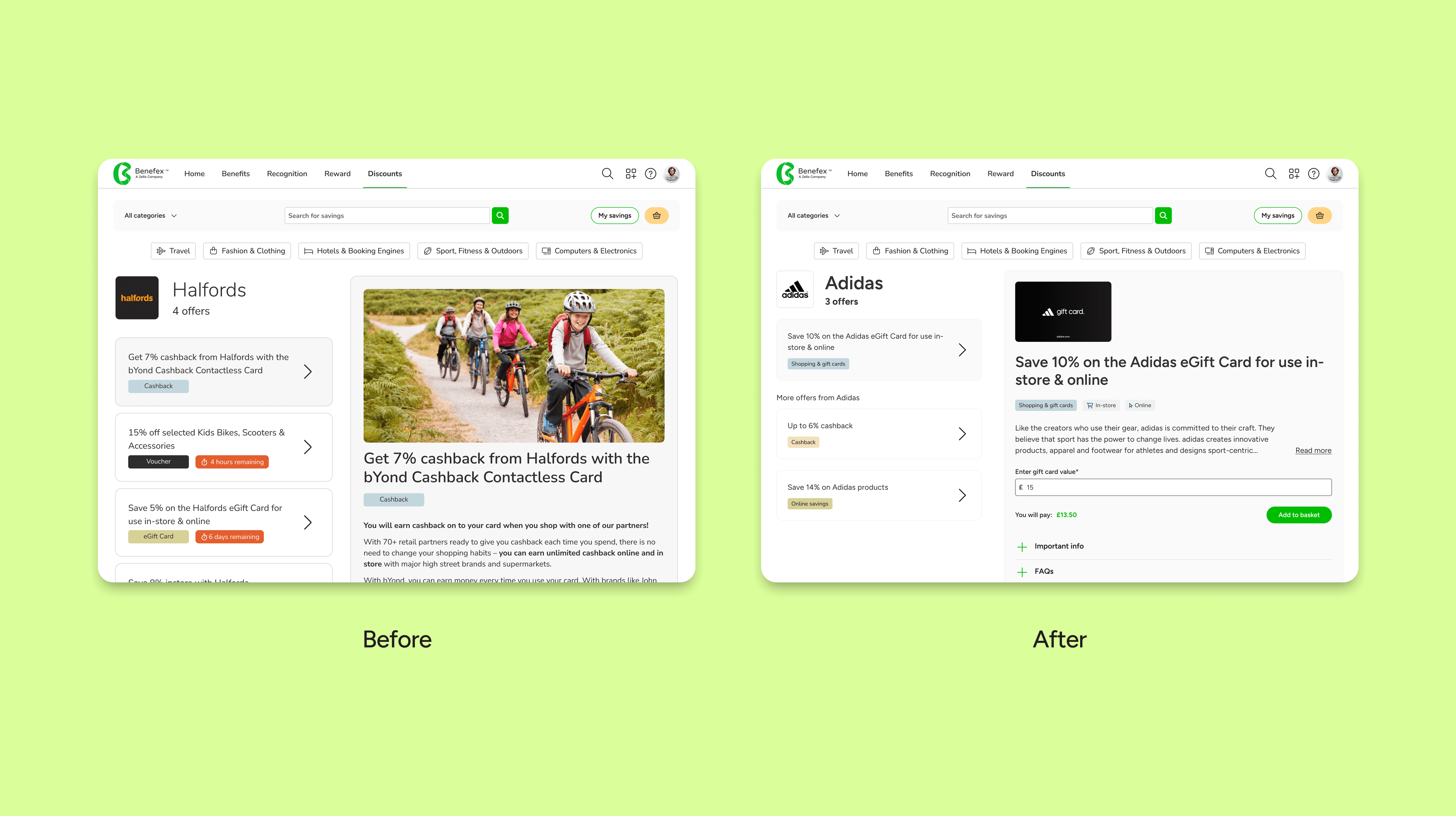The goal was to migrate a gift card checkout journey from a third party provider onto the Benifex employee Discounts product. This would allow us to accurately record purchases, improve our data analytics and generate extra revenue for the business.